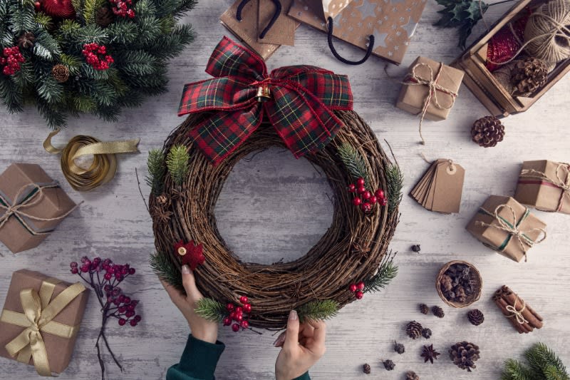 Spread holiday cheer on your home’s exterior. Hang vibrant lights, lanterns, wreaths, and twigs. Add a vibrant welcome mat and potted plants to set the stage for your guests.